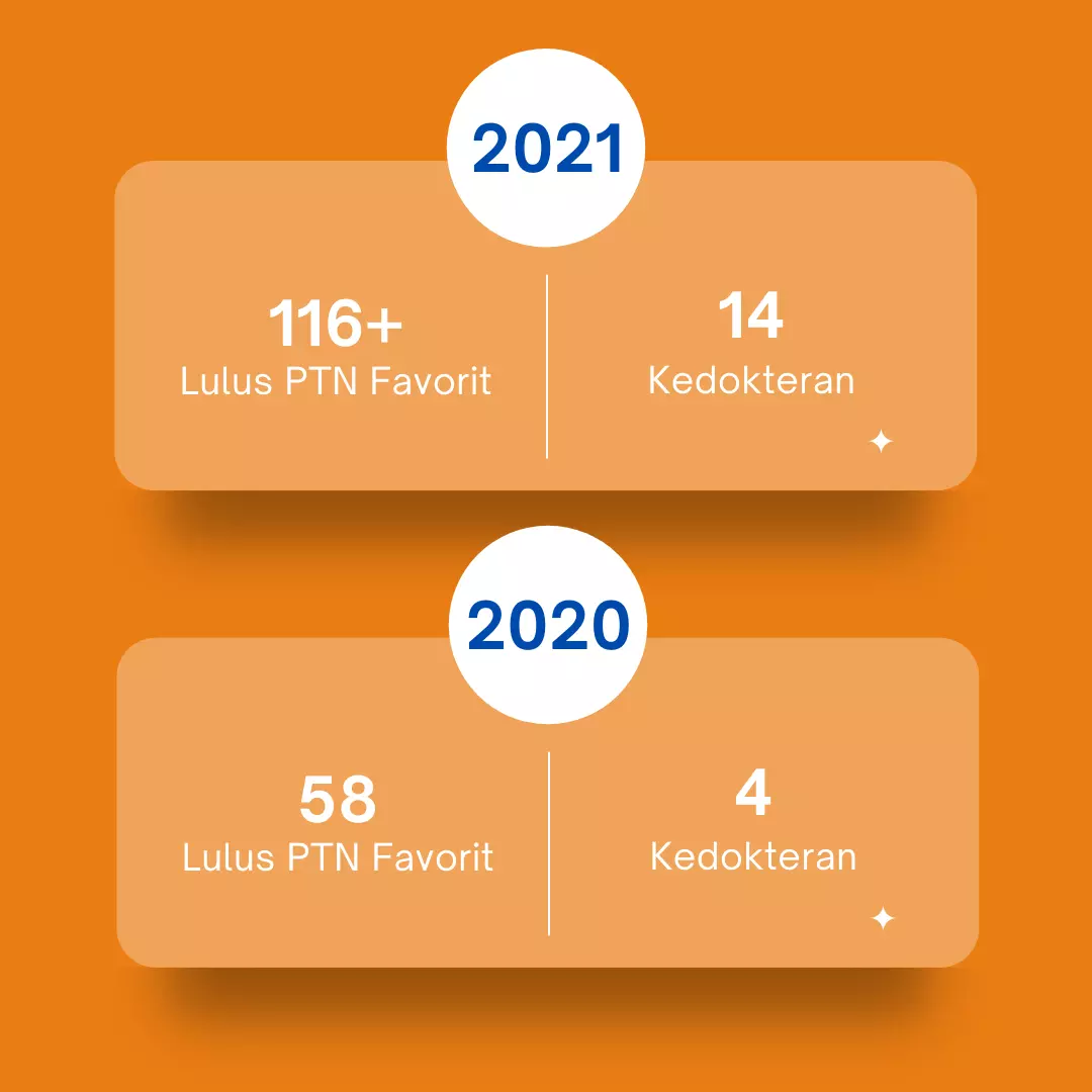 Di tahun 2021, kami berhasil meloloskan 116 siswa siswi kami meraih cita-cita berkuliah di Perguruan Tinggi Negeri Terbaik (100% Lolos PTN) Anda kah Selanjutnya?