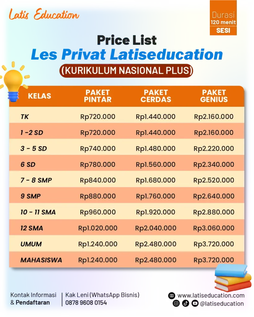 Biaya les di Latis Education cukup kompetitif jika dibandingkan dengan kualitas yang diberikan. Tersedia berbagai pilihan paket yang bisa disesuaikan dengan kebutuhan siswa, baik untuk jangka pendek maupun jangka panjang.