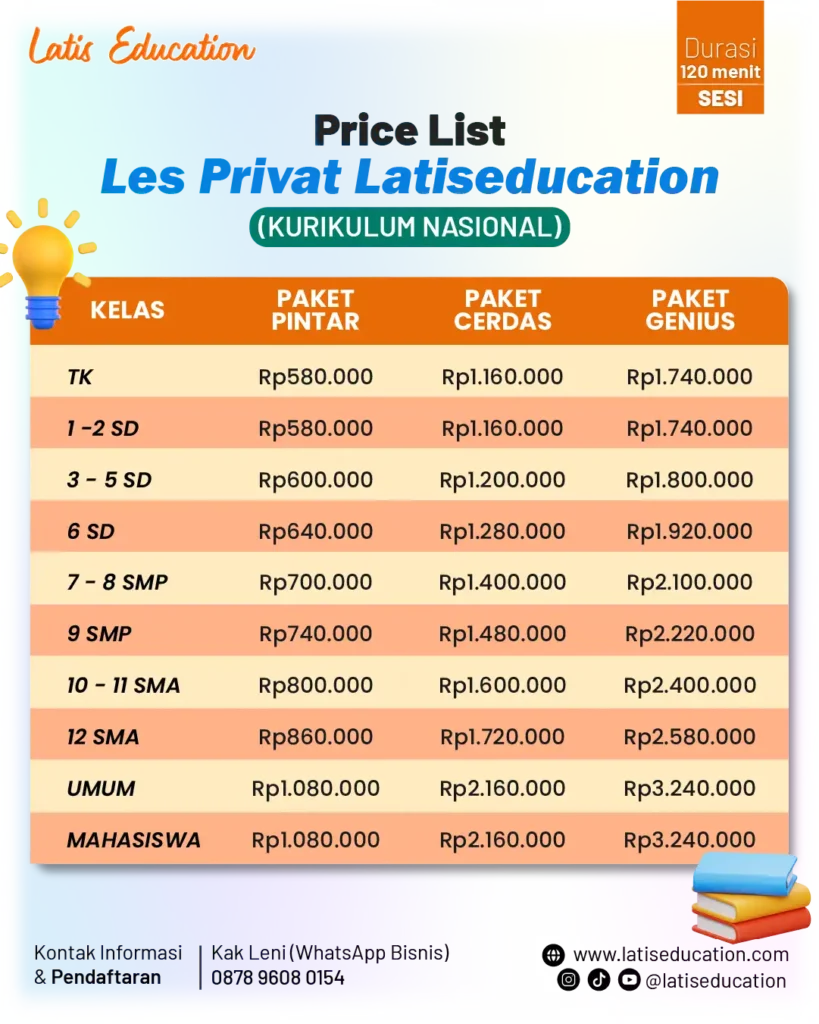 Daftar sekarang juga! Hubungi kami sekarang melalui telepon (021) 77844897 atau chat via WhatsApp 087896080154. Kunjungi website resmi kami di www.latiseducation.com dan follow juga Instagram Bimbel UTBK SNBT – Latis Education untuk info dan promo menarik lainnya!